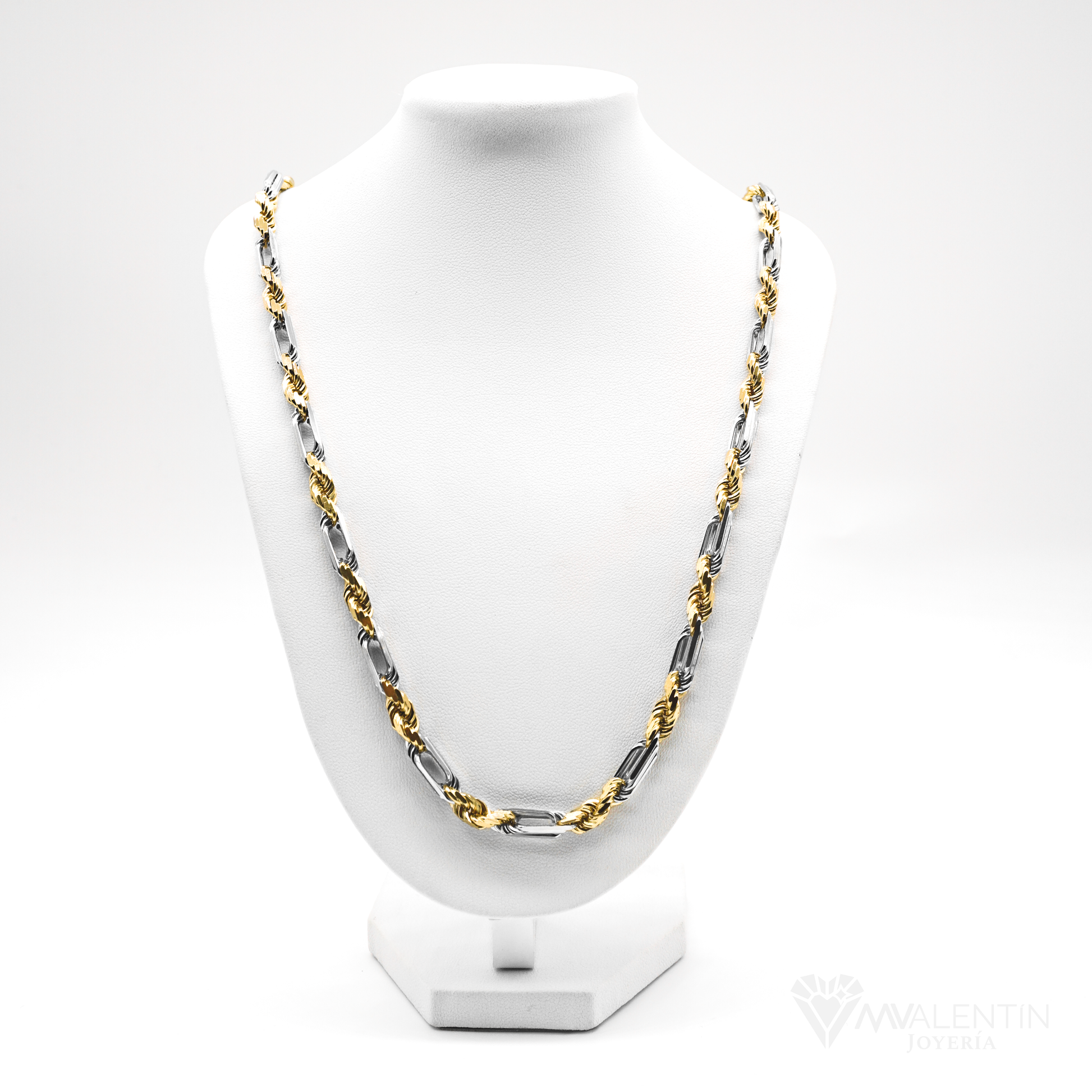 Nuestra Cadena Fígaro bicolor es un símbolo de fuerza y conexión. Fabricada con maestría en Oro Blanco y Amarillo 14K, esta joya de 65.1 gramos está diseñada para perdurar y convertirse en un legado familiar.