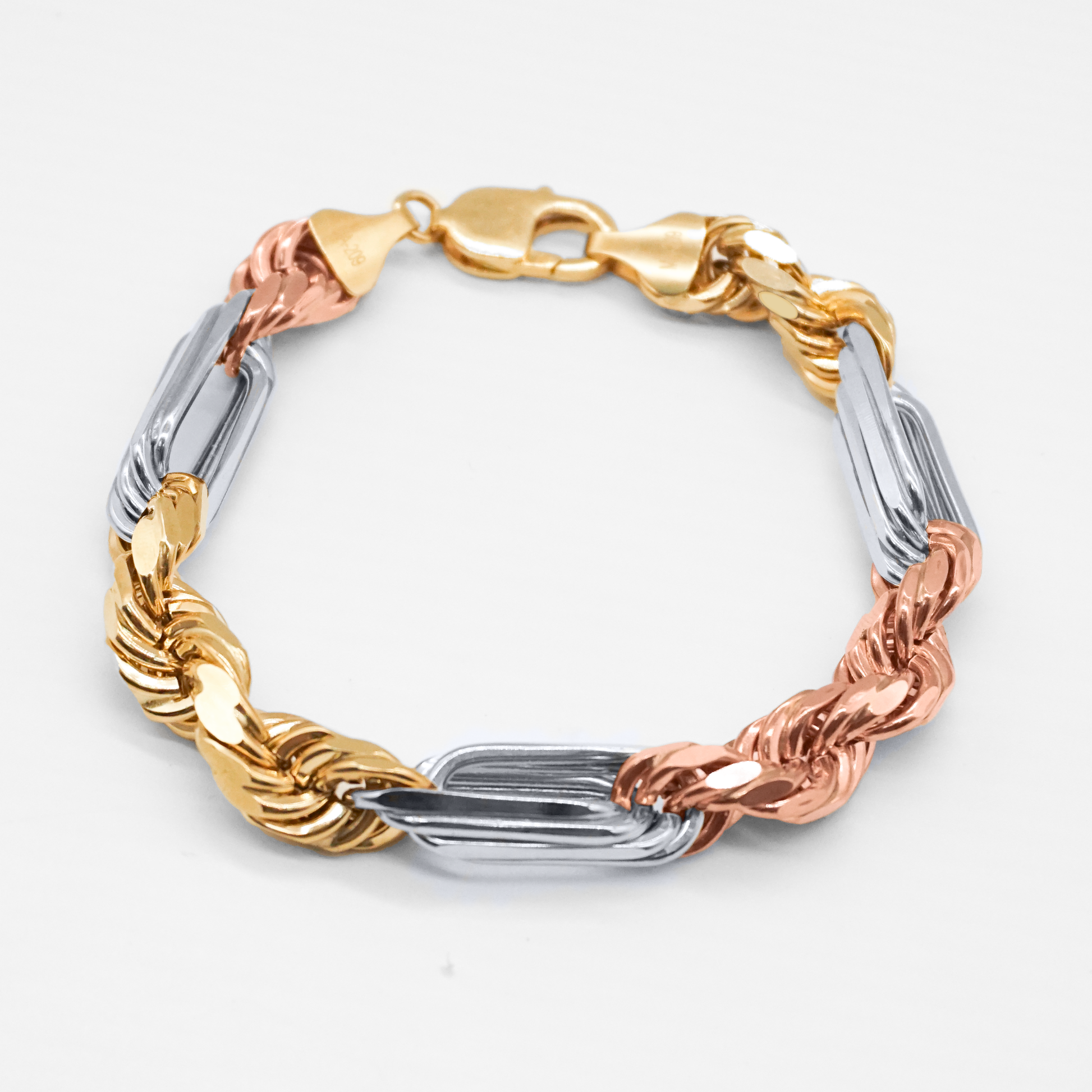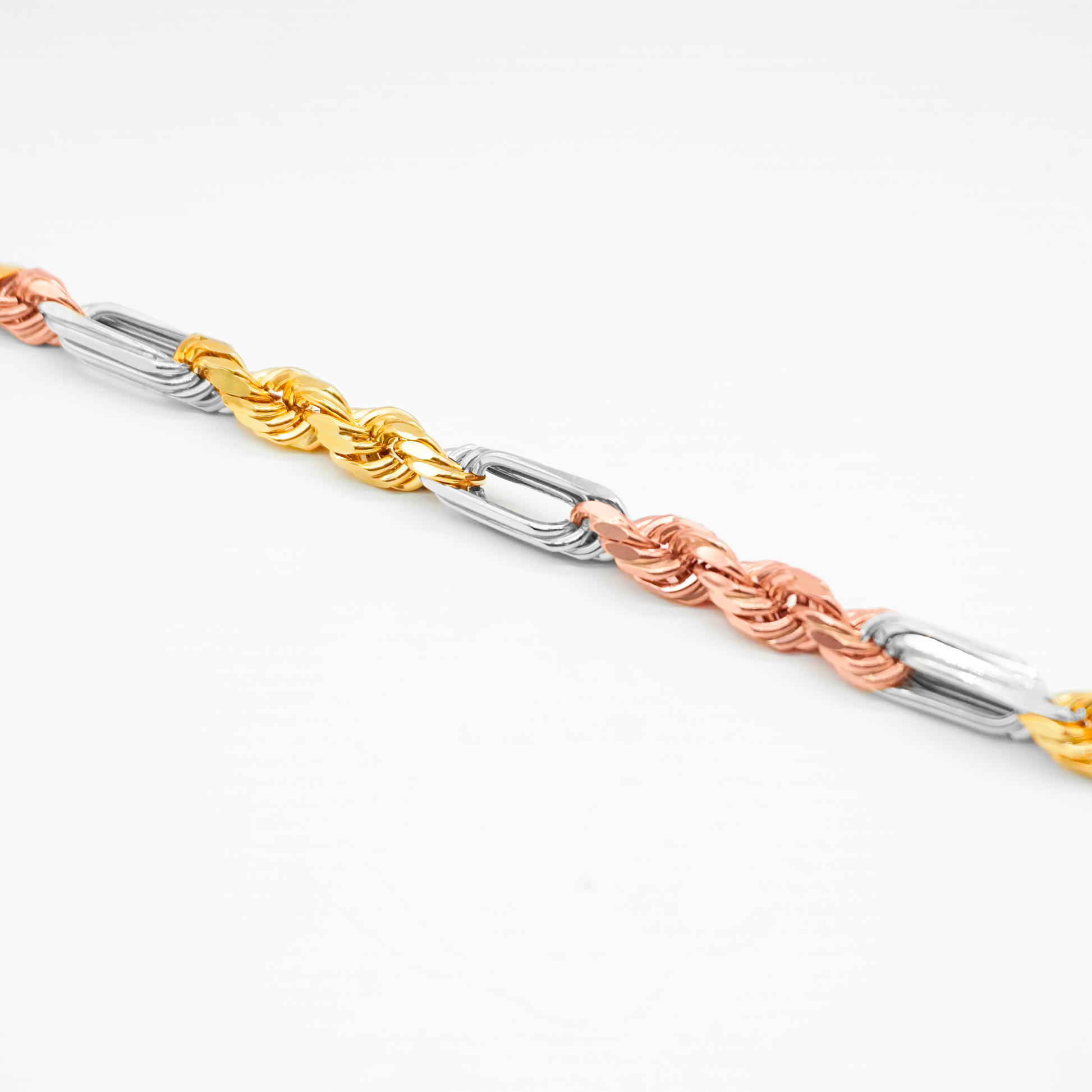 Diseño impactante que mezcla eslabones tipo Figaro y cuerda en oro amarillo, blanco y rosa. Lujo y estilo moderno. Una pieza que deslumbra. Ideal para quien busca exclusividad y calidad.