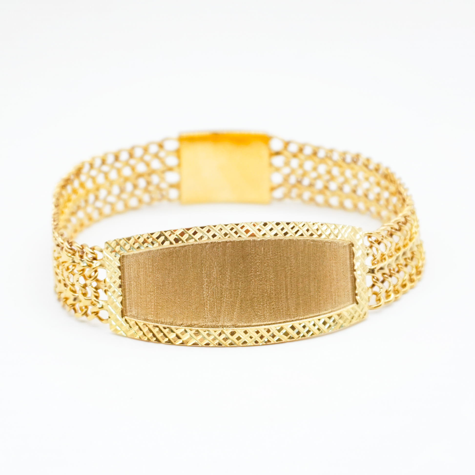 Imponente esclava tejido petatillo en oro 10K. Destaca por su robustez y su gran placa de acabado mate con bordes diamantados que capturan la luz. Una pieza sólida de alta jerarquía, diseñada para brindar distinción y elegancia atemporal en tu muñeca.