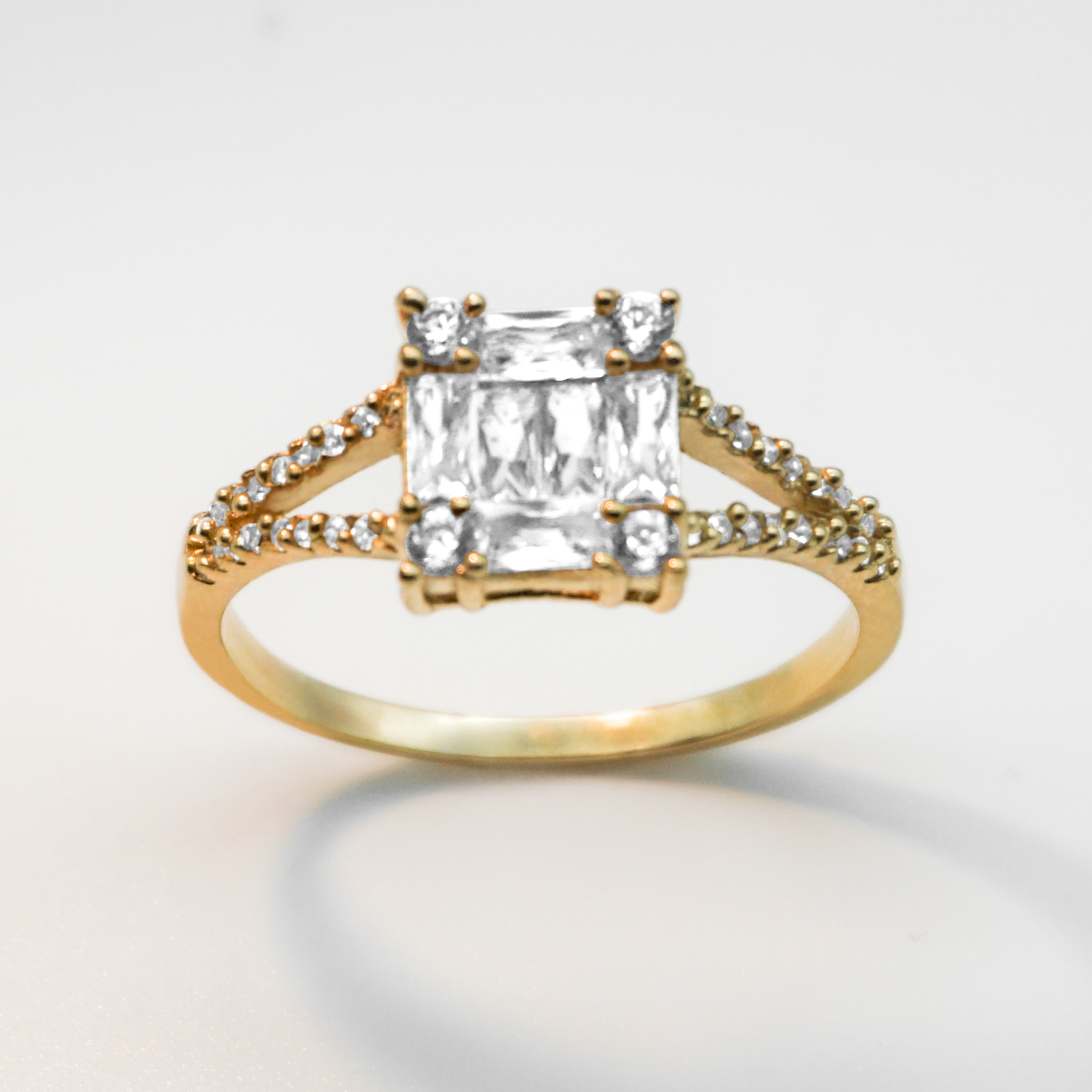 Un diseño clásico reinventado. 💍 Este anillo presenta una deslumbrante circonia central en corte rectangular, enmarcada por cuatro garras que le dan un toque moderno y único. La elegancia se extiende a lo largo de la banda, que se divide en dos brazos sutiles, cada uno adornado con un delicado pavé de circonias, añadiendo un brillo excepcional desde cualquier ángulo.